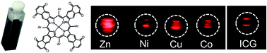 Photoacoustic (PA) imaging is an emerging non-invasive diagnostic modality with many potential clinical applications in oncology, rheumatology and the cardiovascular field. For this purpose, there is a high demand for exogenous contrast agents with high absorption coefficients in the optical window for tissue imaging, i.e. the near infrared (NIR) range between 680 and 950 nm. We herein report the photoacoustic properties of quinone-fused porphyrins inserted with different transition metals as new highly promising candidates. These dyes exhibit intense NIR absorption, a lack of fluorescence emission, and PA sensitivity in concentrations below 3 nmol mL−1. In this context, the highest PA signal was obtained with a Zn(II) inserted dye. Furthermore, this dye was stable in blood serum and free thiol solution and exhibited negligible cell toxicity. Additionally, the Zn(II) probe could be detected with an up to 3.2 fold higher PA intensity compared to the clinically most commonly used PA agent, ICG. Thus, further exploration of the ‘quinone-fusing’ approach to other chromophores may be an efficient way to generate highly potent PA agents that do not fluoresce and shift their absorption into the NIR range.