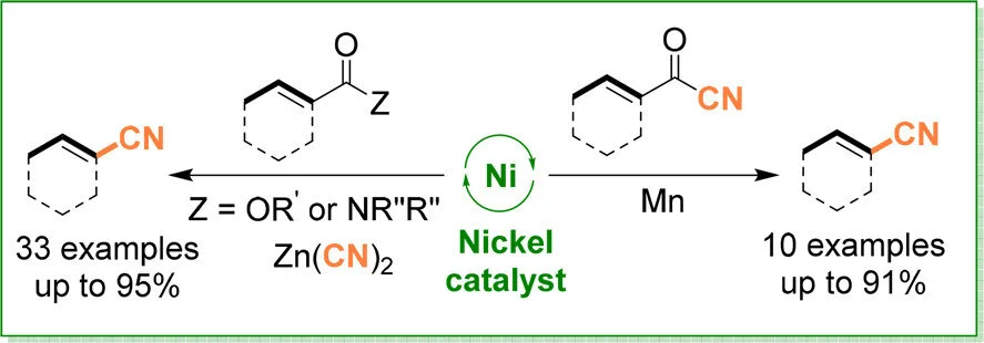 Herein we describe the first nickel-catalyzed decarbonylative cyanation protocol which allows the transfer of a series of readily available aryl and heteroaryl esters as well as amides to the corresponding nitriles. This protocol provides a new possibility to cleave carboxylic esters and amides while forming a C–CN bond. The newly developed protocols successfully suppress the undesired acyl cyanide formation, nitrile product decomposition, and catalyst poisoning processes. In order to prevent byproduct formation, a nickel(II)-catalyzed extrusion recombination fragment coupling strategy allows direct access to aryl, heteroaryl, and cinnamonitriles starting from the corresponding acyl cyanides. The new methods are characterized by high efficiency, chemoselectivity, and excellent functional group tolerance, providing a practical and versatile approach to a wide range of aryl and heteroaryl nitriles.