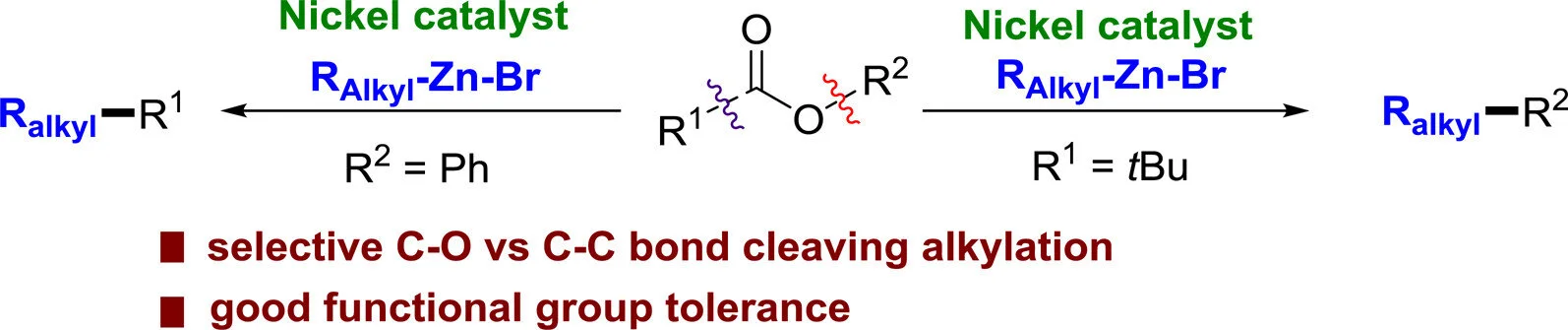 We have developed two nickel-catalyzed aryl–alkyl cross-coupling reactions using esters as electrophilic coupling partners. The right choice of ester and catalyst allows controlling the selective oxidative addition of nickel to an acyl C–O or an aryl C–O bond, thus allowing the selective introduction of alkyl groups to the carboxylic acid component via decarbonylative bond cleavage or phenol component via C–O bond cleavage. The protocols are characterized by their efficiency and functional group tolerance with regard to both coupling partners. The newly developed aryl–alkyl cross-coupling reactions described herein may not only become a good alternative to the standard halide-based cross-couplings but also lead to late-stage synthetic strategies and unconventional utilization of esters and their carboxylic acid and phenol precursors in synthetic chemistry. Moreover, the synthetic utility has been demonstrated by the application of the method to the synthesis of naproxen analogues. Although further mechanistic and computational studies need to be part of our future research, we believe that the direct replacement, in particular, the first example of a direct exchange of the ester moiety by a long chain functionalized alkyl chain, will be of use in retrosynthesis, late-stage functionalizations, and synthesis in general.