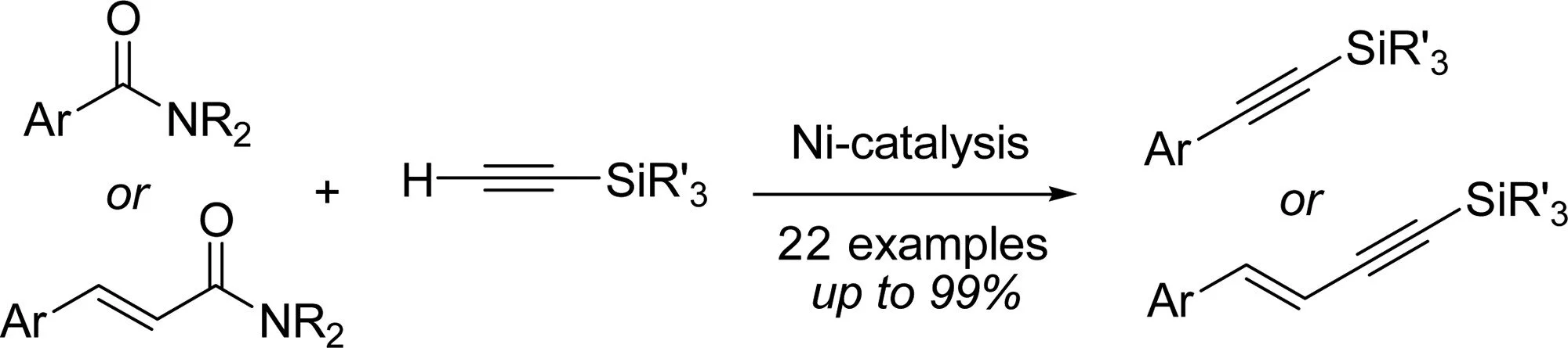 A new and selective cross-coupling reaction of amides with terminal alkynes as coupling partners has been developed. The direct, one-step transformation of an aryl or alkenlyl amide to the corresponding alkyne was previously not known and is, with conventional methods, difficult to achieve. Thus, the newly developed methodology enables a facile route for C(sp2)–C(sp) bond formation in a straightforward fashion by successful suppression of the undesired homocoupling process. Various terminal silyl alkynes and a wide range of aromatic amides bearing various substituents are tolerated in this process, which afforded products in good to excellent yields. The utility of this newly developed protocol has been demonstrated in the synthesis of enynes as well as large-scale synthesis of silylated alkynes. Given the simplicity and generality of the protocol, it is anticipated that it should find application in synthesis, retrosynthesis, and late-stage modification.