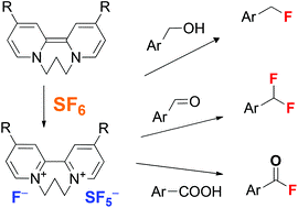 We report the use of organic electron donors for the activation of the greenhouse gas, sulphur hexafluoride. Bipyridine-based organic electron donors were found to react fast and selectively with SF6 at ambient temperature in non-polar aprotic solvents within minutes to yield solid ion pairs consisting of donor dications [D2+] and fluoride [F−] and [SF5−] anions. The presence of the SF5− anion was confirmed by NMR- and IR-spectroscopy analysis. The salts can be isolated and also be applied as fluorinating reagents. This was demonstrated by the deoxofluorination of alcohols, aldehydes as well as carboxylic acids. Thus, SF6 is a readily available and stable precursor for the otherwise more difficult to handle deoxofluorinating reagent, sulphur tetrafluoride. Given the simplicity of the procedure it can be used for both, the decomposition of one of the most potent greenhouse gases and at the same time the generation of a powerful fluorinating reagent. Further applications of this metal-free activation of SF6 as well as demonstration to reuse and recycle the electron donors are currently part of our further research.
