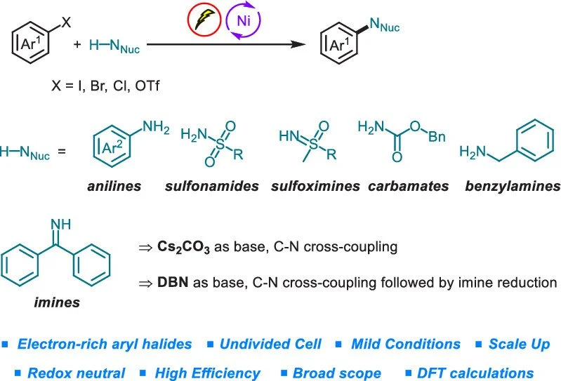 A nickel-catalyzed cross-coupling amination with weak nitrogen nucleophiles is described. Aryl halides as well as aryl tosylates can be efficiently coupled with a series of weak N-nucleophiles, including anilines, sulfonamides, sulfoximines, carbamates, and imines via concerted paired electrolysis. Notably, electron-deficient anilines and sulfonamides are also suitable substrates. Interestingly, when benzophenone imine is applied in the arylation, the product selectivity toward the formation of amine and imine product can be addressed by a base switch. In addition, the alternating current mode can be successfully applied. DFT calculations support a facilitated reductive elimination pathway.