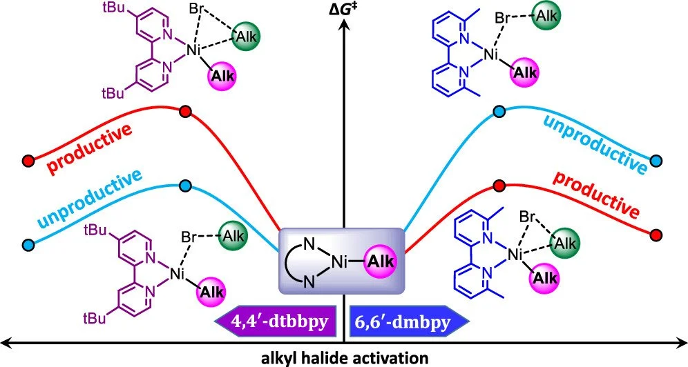 Computational analysis of the arylation of aliphatic Csp3–H bonds catalyzed by decatungstate–nickel validates the reaction mechanism and provides valuable insights into how to accomplish the corresponding alkylation. Our analysis indicates that the light-excited decatungstate photocatalyst activates one of the Csp3–H bonds by a hydrogen atom transfer reaction involving the bridging O atoms of decatungstate. The generated alkyl radical reacts with a bipyridine-based Ni catalytic species to form a NiI-alkyl intermediate. Oxidative addition of aryl bromide to this intermediate leads to a NiIII complex, from which the cross-coupling product is liberated via reductive elimination. We also investigated the corresponding prototype reaction where the aryl bromide is replaced by an alkyl bromide, which suggested a too high energy barrier for the oxidative addition of the alkyl bromide to the NiI-alkyl intermediate. Variation of the steric and electronic properties of the bipyridine ligand suggests that steric encumbrance in the 6,6′ position can promote oxidative addition of the alkyl bromide as verified by ad hoc experimental tests.