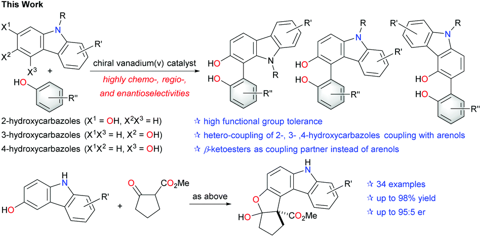 The catalytic enantioselective oxidative hetero-coupling of arenols using a chiral vanadium(V) complex has been developed. The coupling of hydroxycarbazole derivatives with various arenols provided axially chiral biarenols with high chemo-, regio-, and enantioselectivities. The reaction took place under mild conditions and exhibited satisfactory functional group tolerance. Aerobic oxidative hetero-coupling with β-ketoesters also proceeded with high chemo- and stereoselectivities under slightly modified reaction conditions.