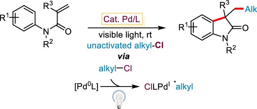 Excited-state palladium catalysis is an efficient process for the alkylation of diverse organic compounds via the generation of alkyl radicals from alkyl bromides and iodides. However, the generation of alkyl radicals from more stable alkyl chlorides remains challenging. Herein, we demonstrate the excited-state palladium-catalyzed synthesis of oxindoles and isoquinolinediones via alkylation/annulation reaction by overcoming inherent limitations associated with unactivated C(sp3)–Cl bond activation at room temperature.