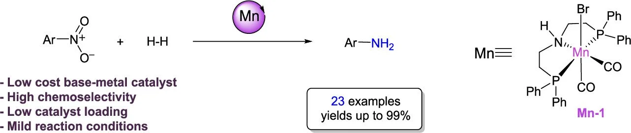 The reduction of nitroarenes to anilines as well as azobenzenes to hydrazobenzenes using a single base-metal catalyst is reported. The hydrogenation reactions are performed with an air-and moisture-stable manganese catalyst and proceed under relatively mild reaction conditions. The transformation tolerates a broad range of functional groups, affording aniline derivatives and hydrazobenzenes in high yields. Mechanistic studies suggest that the reaction proceeds via a bifunctional activation involving metal–ligand cooperative catalysis.