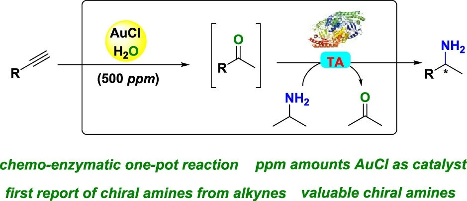 A one-pot chemoenzymatic sequential cascade for the synthesis of chiral amines from alkynes was developed. In this integrated approach, just ppm amounts of gold catalysts enabled the conversion of alkynes to ketones (>99%) after which a transaminase was used to catalyze the production of biologically valuable chiral amines in a good yield (up to 99%) and enantiomeric excess (>99%). A preparative scale synthesis of (S)-methylbenzylamine and (S)-4-methoxy-methylbenzylamine from its alkyne form gave a yield of 59 and 92%, respectively, with ee > 99%