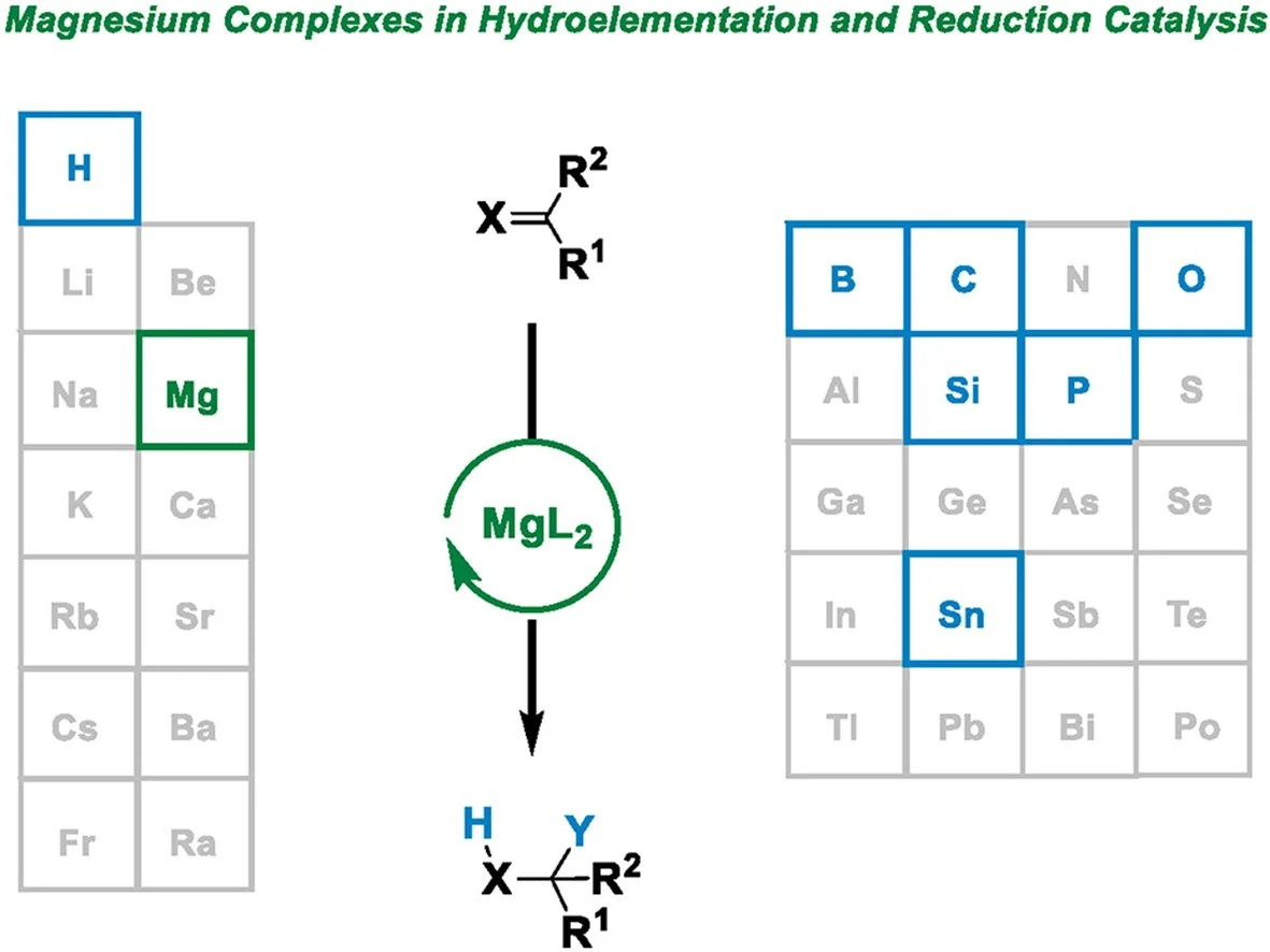 The addition of a Y–H (Y = B, Si, Sn, N, P, and O) bond and H2 to unsaturated bonds is a powerful and atom-economic method for the synthesis of fine chemicals. In the recent years, magnesium-based organometallic complexes have appeared as an alternative to transition metal catalysts for the hydrofunctionalization and hydrogenation of unsaturated systems. This review focuses on the progress of magnesium catalysis for the hydrofunctionalization and hydrogenation of unsaturated bonds, provides a critical assessment of the state-of-the-art research, highlights the major developments achieved in the past three years, and provides an overview of the challenges and opportunities.