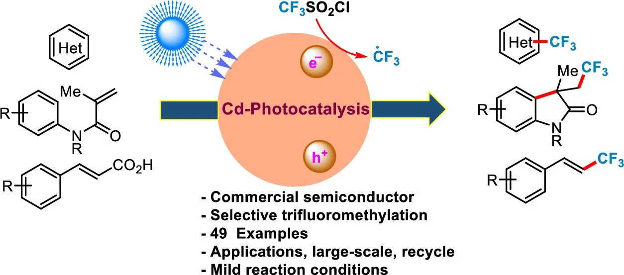 The field of heterogeneous photoredox catalysis has grown substantially and impacted organic synthesis because of the affordability and reusability of catalysts. This study reports radical trifluoromethylation with Cd–chalcogenide semiconductors. Cd semiconductors, particularly CdSe, are readily available, commercial, visible-light-responsive, heterogeneous photocatalysts. The potential of readily available Cd semiconductors, particularly CdSe, is confirmed by their increased photocatalytic activity toward trifluoromethylation with various substrates, such as (hetero)arenes and vinylic amides/acids, via addition, cyclization, and decarboxylation under visible light. The economic significance of this strategy is also highlighted through the scalable synthesis of biologically active molecules followed by catalyst reuse. Moreover, these catalysts are relatively inexpensive compared with transition metal-based homogeneous photocatalysts, presently used in organic synthesis.